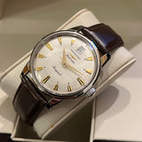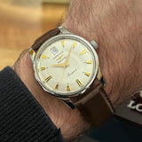 Diameter 35 mm. Thickness 9.9 mm. Stainless steel case. Smooth stainless steel bezel. Sunburst silver dial without numerals. Gold-colored hands and indices. Sapphire crystal. Automatic movement. Caliber L633. Power reserve of 38 hours. Solid stainless steel case back with Longines emblem. Replacement non-original brown leather strap. Steel pin buckle with Longines emblem.