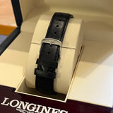 Diameter 38.50 mm. Stainless steel case. Smooth steel bezel. Silver dial without numerals. Gold hands and indexes. Sapphire crystal. Automatic movement. Caliber L650. Solid steel case back with Longines emblem. Original Longines black leather strap. Steel pin buckle with Longines emblem.