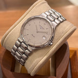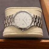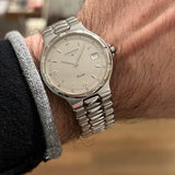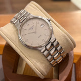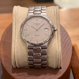 Diameter 34 mm. Wrist circumference 16.8 cm. Stainless steel case and bracelet. Stainless steel bezel. Silver dial without numerals. Luminous hands and markers. Sapphire crystal. Quartz movement. Solid stainless steel case back with Longines emblem. Double folding clasp in steel with Longines emblem.