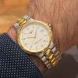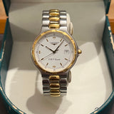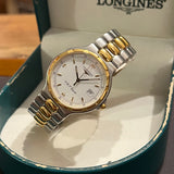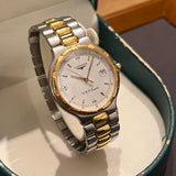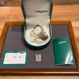 Diameter 34 mm. Wrist circumference 17.4 cm. Case and bracelet in steel and gold-plated. Gold steel bezel. White dial without numerals. Gold hands and markers. Quartz movement. Solid steel case back with Longines emblem. Double deployant clasp with Longines emblem.