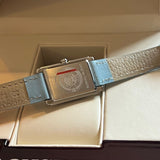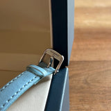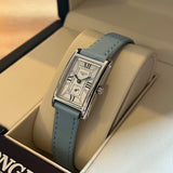 Diameter 20.80 x 32.00 mm. Thickness 6.9 mm. Lug spacing 15 mm. White dial with Roman numerals. Blued hands. Quartz movement caliber L178. Stickers present on the solid case back with Longines emblem. Non-original replacement blue strap. Original Longines pin buckle.