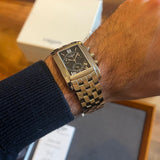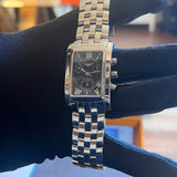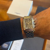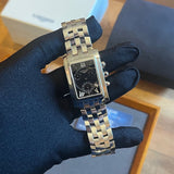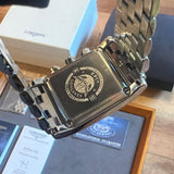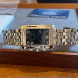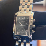 Dimensions: 35 mm * 29 mm. Stainless steel case and bracelet. Black dial. Sapphire crystal. Double folding clasp. Quartz movement. Functions: hours, minutes, date, small seconds, chronograph.