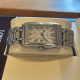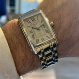 Dimensions: 28.20mm * 47mm. Wrist size without the 2 extra links: 17.3 cm. Case and bracelet in stainless steel. Smooth steel bezel. Silver guilloché dial with Roman numerals. Blued hands. Sapphire crystal. Automatic movement. Solid steel case back with Longines emblem. Double folding steel clasp with Longines emblem.