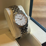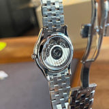 Diameter 33.5 mm. Stainless steel case and bracelet. Automatic movement. Screwed transparent caseback. Double folding clasp. White dial without numbers.