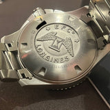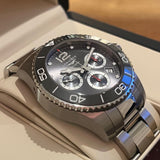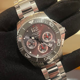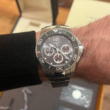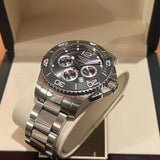 Diameter: 43 mm. Water-resistant up to 300 meters. Stainless steel case and bracelet. Gray dial without numerals. Rotating bezel. Automatic movement. Functions: hours, minutes, date, chronograph.