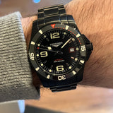 Diameter 41 mm. Wrist size 19.1 cm. Case and bracelet in steel with black PVD coating. Black rotating steel bezel. Black dial with Arabic numerals. Sapphire crystal. Automatic movement. Caliber L888.2. Solid steel case back with Longines emblem. Steel deployment clasp with black PVD coating and Longines emblem.