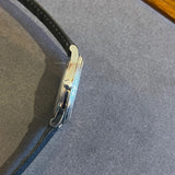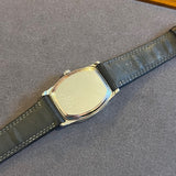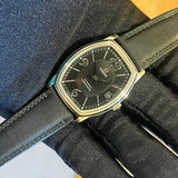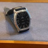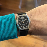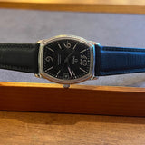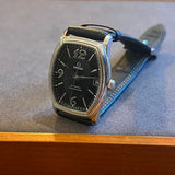Diameter 31.2 x 35.6 mm. Steel housing. Automatic movement. Black dial, Arabic index. Replacement pin buckle. Non-original black leather strap.
