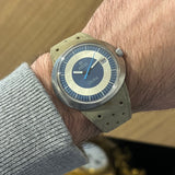 Diameter 41 mm. Thickness 11 mm. Stainless steel case. Blue and white dial without numerals. Plexiglass crystal. Automatic movement. Caliber 565. Solid stainless steel case back. Original beige Omega leather strap. Steel pin buckle with Omega emblem.