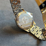 Diameter 34 mm. Wrist size 17.5 cm. Case and bracelet in stainless steel. Smooth steel bezel. Omega crown. Blue dial without numerals. Sapphire crystal. Quartz movement. Solid steel caseback with Omega emblem. Stainless steel deployant clasp with Omega emblem.
