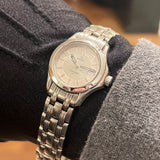 Diameter 25 mm. Wrist size 14.7 cm. Case and bracelet in stainless steel. Smooth steel bezel. Textured silver dial without numerals. Blued hands. Sapphire crystal. Quartz movement. Caliber 1424. Solid steel case back with Omega emblem. Sliding deployant clasp in steel with Omega emblem.