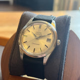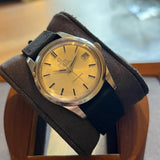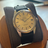 Diameter 35 mm. Stainless steel case. Smooth stainless steel bezel. Omega crown. Silver dial without numerals. Plexiglass crystal. Automatic movement. Solid stainless steel case back with Omega emblem. Replacement off-brand black leather strap. Omega pin buckle.
