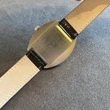 Diameter 35 mm. Stainless steel case. Smooth steel bezel. Silver dial without numerals. Plexiglass crystal. Automatic movement. Solid steel case back with Omega emblem. Replacement black leather strap, not original. Replacement pin buckle, not original.