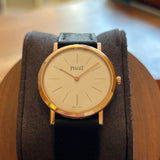 Diameter 34 mm. Case in 18kt 750 pink gold. Smooth bezel in 18kt 750 pink gold. Piaget crown. White dial without numerals. Sapphire crystal. Mechanical movement. Caseback in 18kt 750 pink gold. Black leather replacement strap off brand. Piaget 18kt pink gold pin buckle.