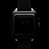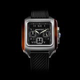 Chronograph Small second Streamliner Kennedy watch, 38.5x38.5 mm. Square brushed steel case with tortoise shell acetate sides. Crown with a lapis lazuli cabochon. Double-layer black dial, white subdial with hollowed Roman and Arabic numerals. Central section with guilloché pattern. 3-Counter Chronograph. Brushed steel "Dauphine" style hands with SuperLuminova® inserts. Ultra-resistant domed mineral crystal. Exclusive 20 mm Briston interchangeable strap, in matt black FKM fluocarbon vulcanized rubber. Miyota JS20 quartz caliber. Water resistant to 50 m/ 5 ATM.