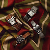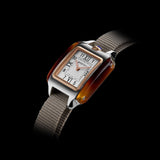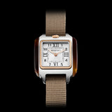 HM Streamliner Kennedy Petite watch, 25x25 mm. Square case in polished steel and rose gold (PVD) with tortoise shell acetate sides. Crown at 12 o'clock with lapis lazuli cabochon. White dial with black Roman and Arabic numerals, central part with railroad minute track and guilloché decoration. Hours and minutes. "Dauphine" style hands in rose gold finish steel with SuperLuminova® inserts. Domed K1 ultra-resistant crystal. NATO strap (12 mm), interchangeable, exclusive to Briston: taupe with rose gold finish steel buckle. Quartz calibre: Swiss Ronda Normtech 751. Water-resistant to 50 m / 5 ATM.