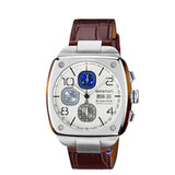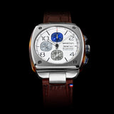 Streamliner Urban chronograph watch - 10th anniversary, 43 mm. Steel and tortoiseshell acetate case. Vertical brushed steel upper bezel with mirror-polished contours and 4 visible screws. Silvered white upper dial with embossed motif. Hours and minutes at centre, small seconds at 9 o'clock, 60-second counter at centre, 30-minute counter at 12 o'clock and 12-hour counter at 6 o'clock. Date and Day with quick correction at 3 o'clock. Brushed steel "baton" hour and minute hands with luminescent inserts. Black lacquered central chronograph hand with red tip. Ultra-resistant sapphire crystal. Brown "alligator" pattern calfskin strap with French flag stitching. Swiss Made SW500a chronograph movement manufactured by Sellita. Oscillating weight with special Briston 10th Anniversary engraving.
