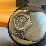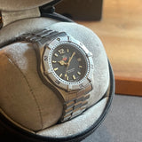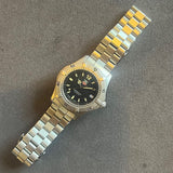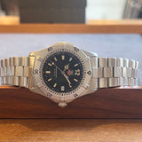 Diameter: 34 mm. Water-resistant to 200 meters. Stainless steel case and bracelet. Black dial with numerals. Rotating bezel. Luminous indexes and hands. Quartz movement.