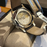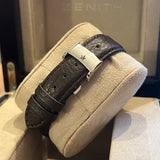 Diameter: 40 mm. Stainless steel case. Silver dial with Arabic numerals. Automatic chronograph movement. Transparent case back. Original brown leather strap by Zenith. Double folding clasp in steel with Zenith emblem.