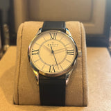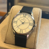 Diameter 33 mm. Stainless steel case. Smooth steel bezel. Zenith crown. White dial with Roman numerals. Blued seconds hand. Sapphire crystal. Automatic movement. Caliber Elite 679. 50-hour power reserve. Transparent case back. Replacement black leather strap (off-brand). Zenith pin buckle.