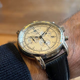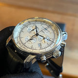 Diameter: 42 mm. Stainless steel case. Silver dial. Water-resistant to 50 meters. Quartz movement. Brand new black leather replacement strap.
