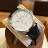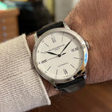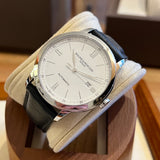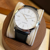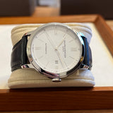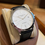 Diameter 42 mm. Stainless steel case. Smooth steel bezel. White dial with Roman numerals. Sapphire crystal. Automatic movement. Sellita SW200 caliber. Power reserve 38 hours. Solid steel case back with Baume & Mercier emblem. Original Baume & Mercier black leather strap. Steel pin buckle with Baume & Mercier emblem.