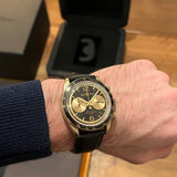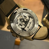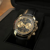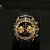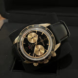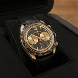 Diameter 41 mm. Water-resistant to 100 meters. Case in CuAIZSi2 Bronze. Original black calfskin leather strap. Graduated Bronze bezel with anodized aluminum insert and tachymeter. Screw-down crown and pushers. Transparent sapphire case back.