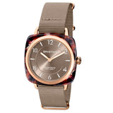 Clubmaster Chic watch, 36 mm. Rose gold-finish steel case and grey/red tortoise shell acetate. Grey taupe sunray dial. Hours and minutes. Baton hands with white luminescent inserts (Superluminova®). Domed mineral crystal. Strap (18 mm), interchangeable, exclusive to Briston: grey taupe with rose gold-finish steel buckle. Miyota 2025 quartz calibre.