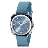 Clubmaster Chic watch, 36 mm. Steel case and blue tortoiseshell acetate. Ice blue sunray dial. Hours and minutes. Baton hands with white luminescent inserts (Superluminova®). Domed mineral crystal. Strap (18 mm), interchangeable, exclusive to Briston: ice blue with steel buckle. Miyota 2025 quartz calibre.