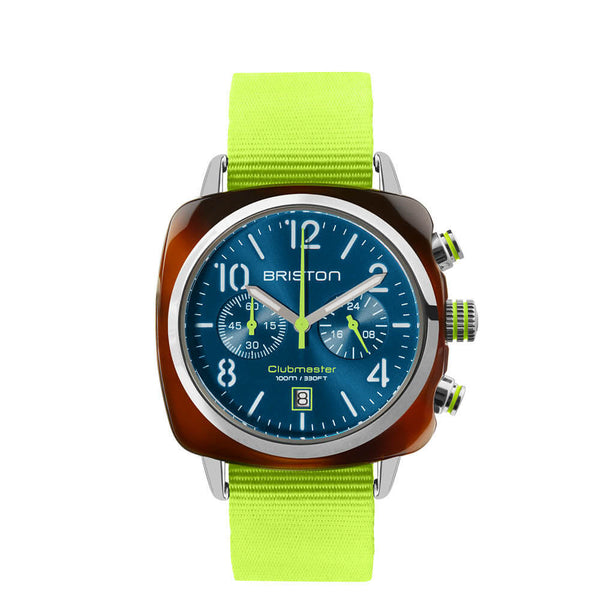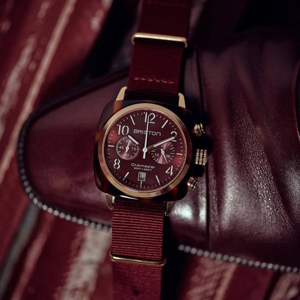Discover the Briston Clubmaster Classic, the signature timepiece from Briston. Inspired by the bold aesthetics of the Roaring Twenties, this watch stands out with its unique "square cambered" case, a retro-modern design that channels the charm of vintage collector’s watches. The 40mm case combines elegance and versatility, while the tortoiseshell acetate adds character and depth, playing with light and transparency for a dynamic look. Watchaser official retailer.