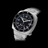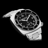 HM automatic Clubmaster Legend Small Second watch, 39 mm. Fully mirror-polished stainless steel case. Open heart on back. Black dial. Hours, minutes, small seconds at 6 o'clock. Bidirectional rotating bezel with 12 o'clock indication. Hands with Superluminova® C1 luminescent inserts. Ultra-resistant sapphire crystal. Water-resistant to 50m / 5 ATM. Exclusive stainless steel bracelet with folding clasp. Miyota 82S5 automatic movement.