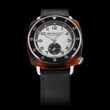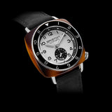 HM automatic Clubmaster Legend Small Second watch, 39 mm. Case in stainless steel and tortoiseshell acetate. Open heart on back. White dial. Hours, minutes, small seconds at 6 o'clock. Bidirectional rotating bezel with 12 o'clock indication. Hands with Superluminova® C1 luminescent inserts. Ultra-resistant sapphire crystal. Water-resistant to 50m / 5 ATM. Exclusive black vintage calfskin leather strap with black stitching. Miyota 82S5 automatic movement.