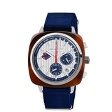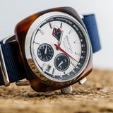 Clubmaster Regatta chronograph watch, 42 mm. Stainless steel and tortoiseshell acetate case. Silvered white dial with raised bars. Chronograph, regatta counter with 5'+5' countdown, 24-hour counter at 3 o'clock and small seconds counter at 6 o'clock. Inner ring with nautical tachymeter scale. Bar hands and indexes with white Superluminova® luminescent inserts. Curved ultra-resistant K1 glass. Water-resistant to 200m / 20 ATM. Exclusive Briston NATO strap in navy blue nylon. Interchangeable without tools. VK83 mechaquartz hybrid movement calibre.