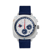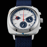Clubmaster Regatta chronograph watch, 42 mm. The Most Beautiful Bays in the World Special edition. Matt white recycled plastic case, produced in Belgium. Silvered white dial with raised bars. Chronograph, regatta counter with 5'+5' countdown, 24-hour counter at 3 o'clock and small seconds counter at 6 o'clock. Inner ring with nautical tachymeter scale. Bar hands and indexes with white Superluminova® luminescent inserts. Curved ultra-resistant K1 glass. Water-resistant to 200m / 20 ATM. NATO OCEAN PET strap in 245 mm, specially designed by Briston and made from recycled plastic waste collected from the Mediterranean Sea. Interchangeable without tools. Water-resistant. Hybrid mechaquartz movement calibre VK83.