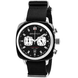 Clubmaster Sport chronograph watch, 42 mm. Steel and black acetate case. Black dial. Chronograph, date, 2 counters. 60-minute counter at 9 o'clock, 24-hour counter at 3 o'clock. Hands with white Superluminova® luminescent inserts. Domed mineral crystal. Exclusive Briston interchangeable strap: black with polished steel buckles. Miyota OS21 quartz calibre.