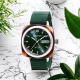 HMS Clubmaster Sport watch, 42 mm. Steel and tortoiseshell acetate case. British green sunray dial. Hours, minutes, seconds and date with day of the week indication. Hands with white Superluminova® luminescent inserts. Domed mineral crystal. Exclusive Briston interchangeable NATO strap: British green with polished steel buckles. Miyota 2405 Japanese quartz calibre.