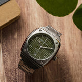 HMS Streamliner Urban automatic watch, 40 mm. Case in brushed steel and tortoiseshell acetate. Upper bezel in brushed steel with mirror-polished finish and 4 screws. Olive green embossed dial. Hours, minutes, seconds and date window at 6 o'clock. Hands with Superluminova® luminescent inserts. Ultra-resistant sapphire crystal. Transparent back. Oscillating movement with "Côte de Genève" decoration. Exclusive Briston 2-strand olive green "soft touch" vulcanised rubber strap with polished steel buckles. Calibre with Japanese automatic movement NH35A.