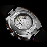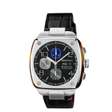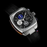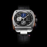 Streamliner Urban chronograph watch - 10th anniversary, 43 mm. Steel and tortoiseshell acetate case. Vertical brushed steel upper bezel with mirror-polished contours and 4 visible screws. Black upper dial with embossed motif. Hours and minutes at centre, small seconds at 9 o'clock, 60-second counter at centre, 30-minute counter at 12 o'clock and 12-hour counter at 6 o'clock. Date and Day with quick correction at 3 o'clock. Brushed steel "baton" hour and minute hands with luminescent inserts. White lacquered central chronograph hand with red tip. Ultra-resistant sapphire crystal. Black "alligator" pattern calfskin strap with French flag stitching. Swiss Made SW500a chronograph movement manufactured by Sellita. Oscillating weight with special Briston 10th Anniversary engraving.