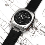 Streamliner Urban chronograph watch, 42 mm. Case in brushed steel and tortoiseshell acetate. Black embossed dial. Chronograph, 2 counters and date window at 6 o'clock. 60-minute counter at 9 o'clock, 24-hour counter at 3 o'clock. Hands with luminescent inserts. K1 resistant mineral crystal - 2.80 mm thick. Exclusive Briston "soft touch" vulcanised rubber 2-piece bracelet: black with polished steel buckles. Miyota OS21 Japanese quartz calibre.