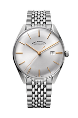 Reference D01-1003 pairs a sun-brushed silver dial with rose-gold accents and