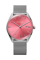 Reference D06-1001 pairs a soft Baby Pink sun-brushed dial with a supple stainless-steel Milanese mesh bracelet, all powered by the long-reserve La Joux-Perret G100 automatic calibre.