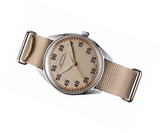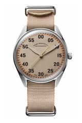 The Elka X series is the sporty version. This model is fitted with a beige Nylon Nato strap. The khaki beige dial is adorned with lines in orange Superliminova, while the hour and minute hands feature Superluminova with a weather-burnt effect. This version is coded with a "w", meaning no date.