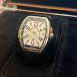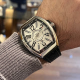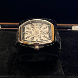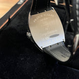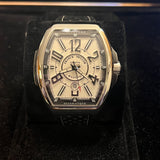 Diameter 44 mm. Thickness 14 mm. Stainless steel case. Smooth steel bezel. White dial with Arabic numerals. Luminescent hands. Sapphire crystal. Automatic movement. Solid steel case back with Franck Muller emblem. Original Franck Muller black leather strap. Double folding clasp with Franck Muller emblem.