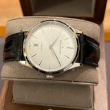 Diameter 39 mm. Thickness 7.8 mm. Stainless steel case. Smooth steel bezel. Silver dial without numerals. Sapphire crystal. Automatic movement. Caliber 899. Power reserve 38 hours. Transparent case back. Replacement black leather strap non-original. Replacement steel pin buckle non-original.