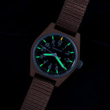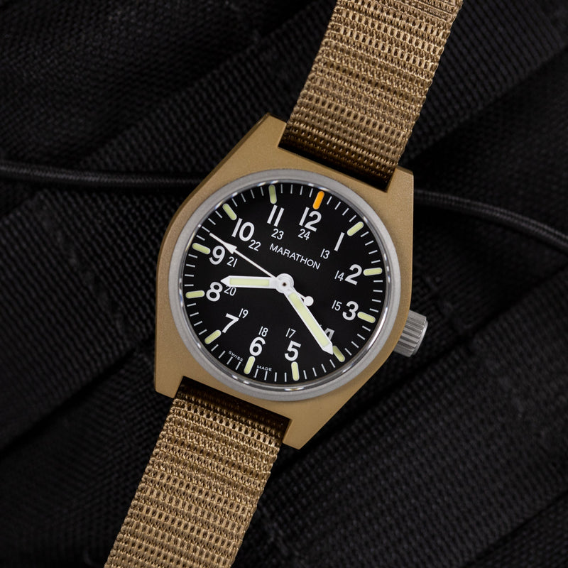 The Marathon 34mm General Purpose Quartz with MaraGlo (GPQ-M) is manufactured in accordance with MIL-PRF-46374G, Type I, Class 1. The hour indices and hands utilize MaraGlo luminescent paint, delivering a bright glow that will shine for up to 8 hours.