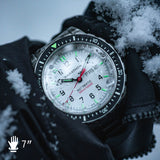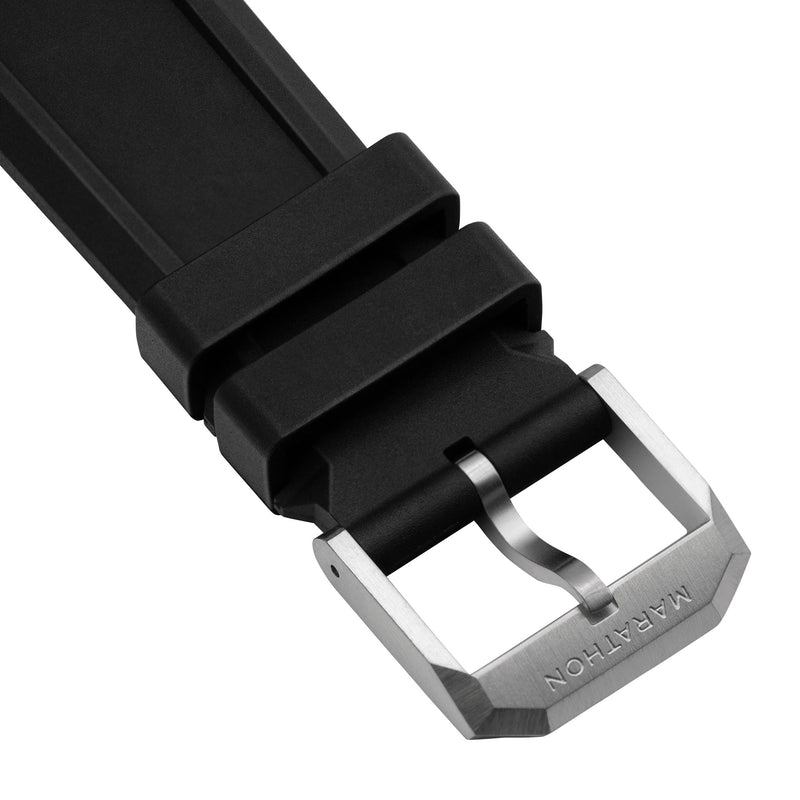 Included with the Arctic JDD is our 3-Piece Rubber Strap Kit, also manufactured in La Chaux-de-Fonds, Switzerland, our strap kit is crafted from FKM Rubber to meet the requirements of high-performance military applications. The 3-Piece Kit comes with one (6 o'clock) tail piece with 8 adjustment holes, and two (12 o'clock) buckle pieces of different sizing that allow the wearer to tailor the length to fit their wrist size.