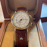 Diameter 36 mm. Thickness 12.2 mm. Stainless steel case. 18-carat yellow gold bezel. White dial and mother of pearl surround with gold Arabic numerals and indices. Blued hands. Sapphire crystal. Automatic movement. Caliber AS 1931. 46-hour power reserve. Transparent case back. Original Maurice Lacroix brown genuine crocodile strap. Original steel pin buckle.