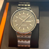 Diameter 42 mm. Wrist circumference without additional links of 17.7 cm. Stainless steel case and bracelet. Smooth steel bezel. Gray dial without numerals. Luminous hands and indexes. Sapphire crystal. Automatic chronometer movement. Solid steel case back with Mido emblem. Steel folding clasp with Mido emblem.