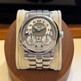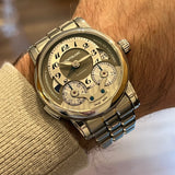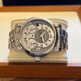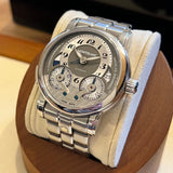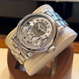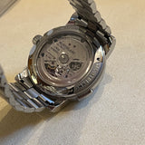 Diameter 43 mm. Wrist size 16.7 cm. Case and bracelet in stainless steel. Smooth steel bezel. Silver dial with Arabic numerals. Luminescent hands. Blued sub-dial hands. Sapphire crystal. Automatic movement. Transparent case back. Double folding steel clasp.