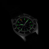 Self-contained tritium gas tubes on the hour markers, and full hand set ensuring constant visibility in low-light environments. Tritium tubes are self-illuminating, containing an isotope of hydrogen that won't dull down over time like photoluminescent paint, meaning the watch will remain fully legible at all hours.