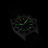 Self-contained tritium gas tubes on the hour markers, and minute/hour hands ensuring constant visibility in low-light environments. Tritium tubes are self-illuminating, containing an isotope of hydrogen that won't dull down over time like photoluminescent paint, meaning the watch will remain fully legible at all hours.